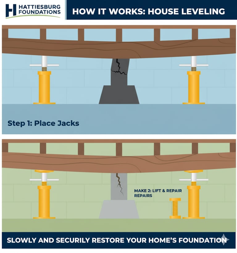 Sagging floors or bouncy rooms? We re‑shim, replace beams, and add supports to level Hattiesburg homes. Free inspection.